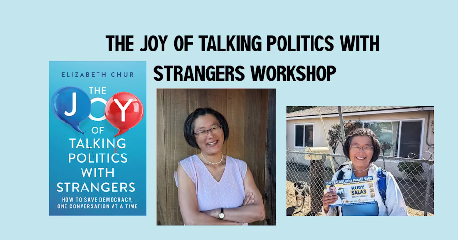 The Joy of Talking Politics to Strangers – Workshop 2 Mar 24 The Joy of Talking Politics to Strangers – Workshop 2 Featured 7:00 pm - 8:15 pm